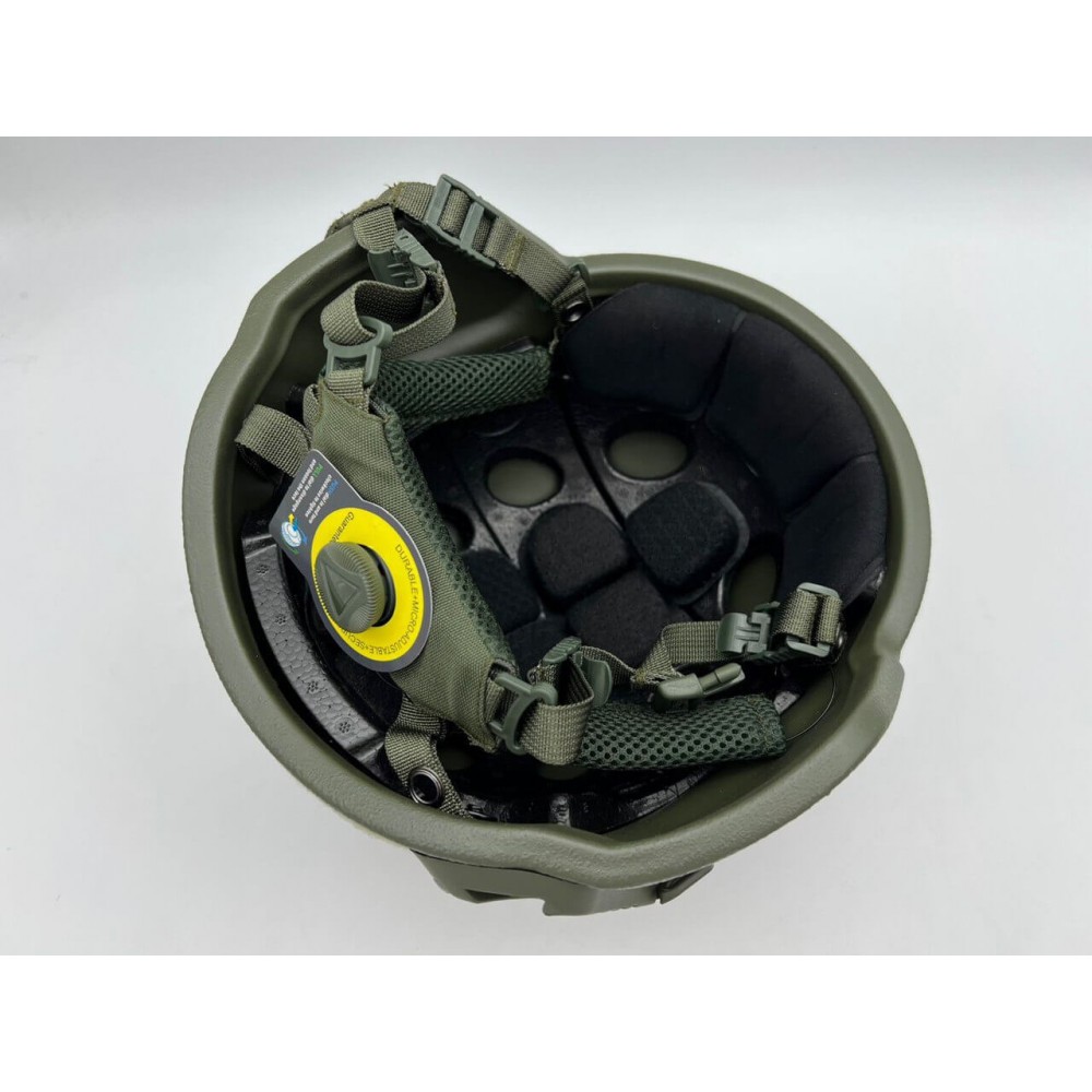 - Материал: Шлем изготовлен из композитного материала на основе арамидного волокна (кевлар), что обеспечивает высокую степень баллистической защиты.